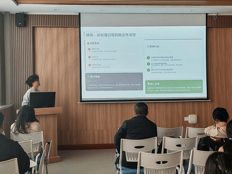 专业实习交流的内容包括:实习公司与岗位介绍、核心实习内容、实践过程学到的知识与技能、心得与感悟及后续实习规划等核心维度。两个专业的学生依次汇报了自己在实习过程中的实践经历,实践岗位具体仪器设备的操作、项目辅助、岗位实务等具体工作的要求与完成情况,详细分享了理论知识与实操结合的收获,也客观梳理了实习中的问题与今后改进方向,不仅体现了同学们认真的实习态度,也展示了实践过程的收获与个人成长。