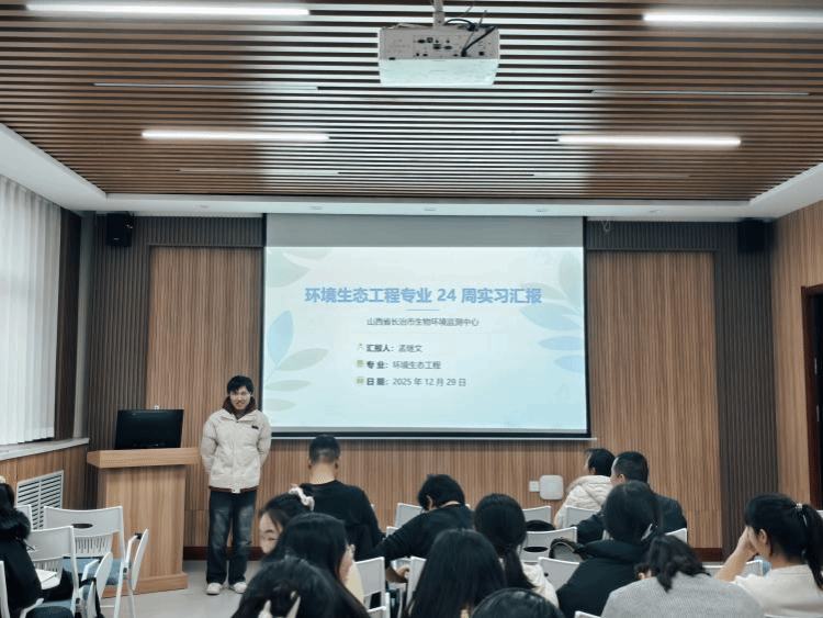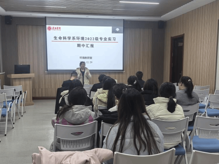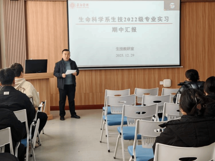 为了全面了解和掌握学生的专业实习进展情况,同时也为了促进不同企业和不同实习岗位的学生交流实习的收获,生命科学系2025年12月29日下午,在图书馆音像资料室召开了2022级生物技术和环境生态工程两个专业的“3+1”实习期中汇报交流会。本次汇报会采用线上线下相结合的形式,系副主任秦永燕,各专业教研室全体成员、生技2201班和环境2201班全体同学参加会议,会议由实习带队教师李进主持。