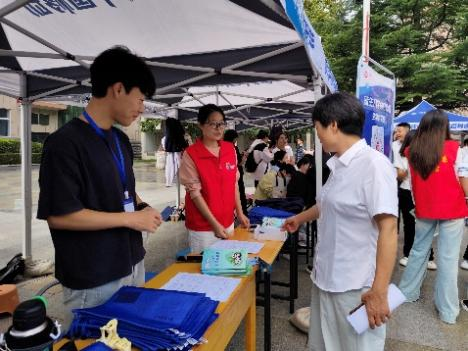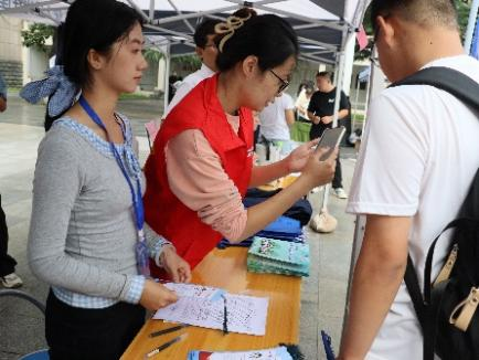 报到第一步:签到交材料,学长学姐在系棚下微笑着等大家来领取物资和宿舍钥匙。