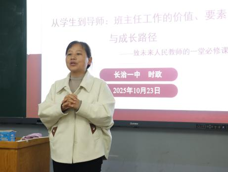 2025年10月23日晚7点至9点,生命科学系2号教学楼124教室召开教育研习讲座。本次讲座特别邀请到长治市第一中学优秀班主任教师时政老师,讲座题目为“从学生到导师:班主任工作的价值、要素与成长路径——致未来人民教师的一堂必修课”。生命科学系生物科学教研室教师及生物科学22级全体学生参加。讲座由教学副主任秦老师主持。