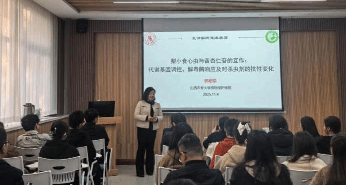 报告中,郭教授从三个维度深入解析了团队的重点研究内容——梨小食心虫响应苦杏仁苷的代谢基因调控及解毒酶系机制。她以严谨的科研逻辑,层层递进地阐述了害虫在面对植物次生代谢物时的分子调控路径,以及解毒酶系在其适应宿主过程中的关键作用,并最终将研究焦点落脚于梨小食心虫杀虫剂抗性机理这一核心应用问题上。清晰的研究脉络、精准的专业解读,让师生们对害虫防治的分子机制有了全新认知。