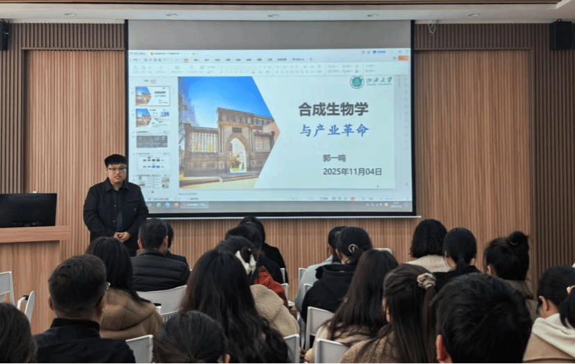随后,郭一鸣博士将视角转向产业应用与市场动态,深入分析了合成生物学在医药研发、生物制造、新能源开发等领域的广阔产业前景。他通过列举国内外典型企业的发展案例和详实的资本投入数据,直观呈现了该领域当前高涨的资本热度与产业落地潜力,为师生们搭建起“学术研究”与“产业应用”之间的桥梁。