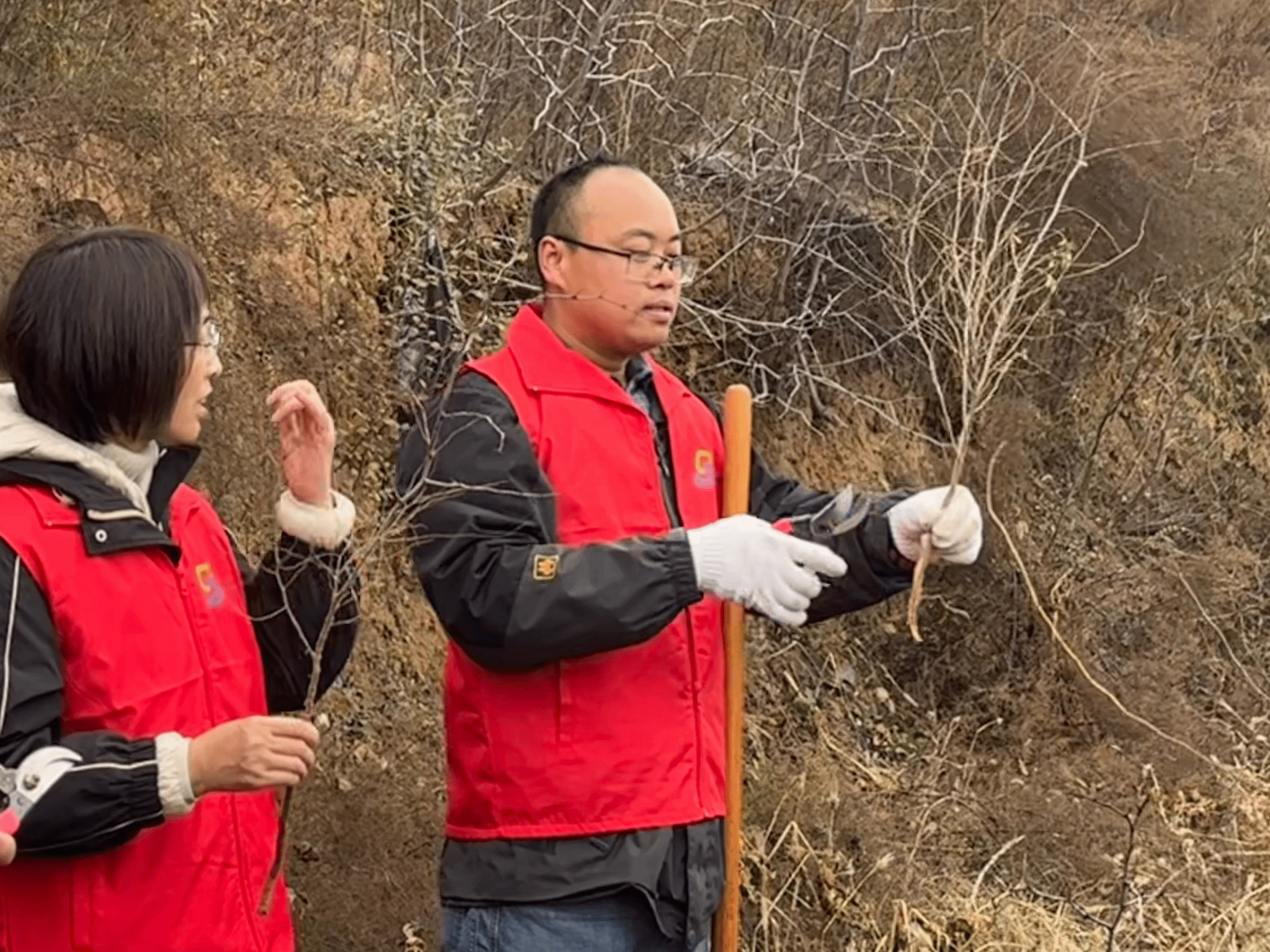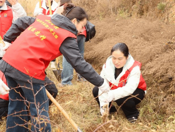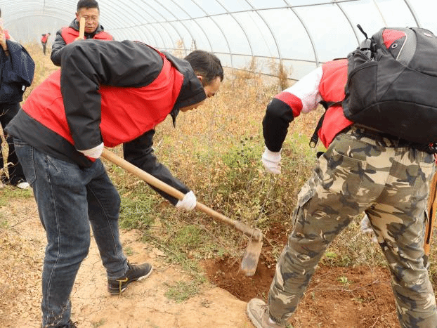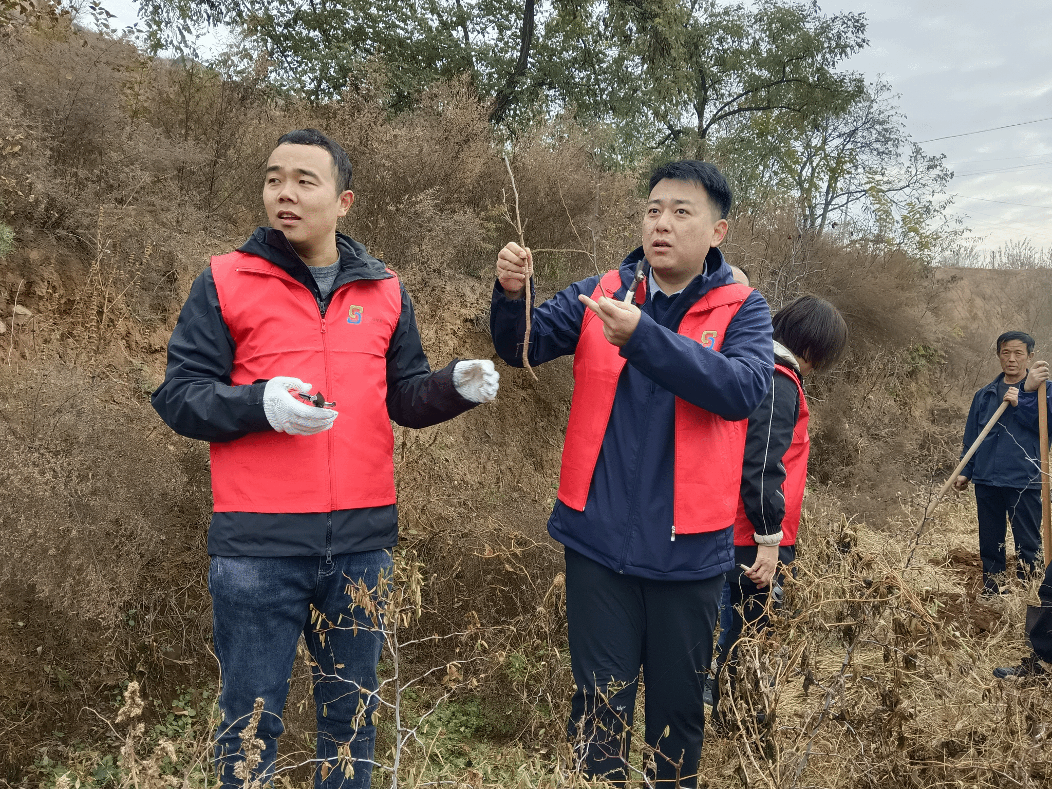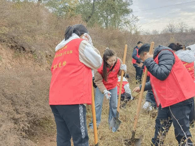 理论讲解结束后,全体党员教师和我校党委组织部成员、驻村工作队的全体队员们亲自示范酸枣树移栽操作,手把手指导农户进行实践,并针对不同植株的生长情况提出个性化的管护建议。